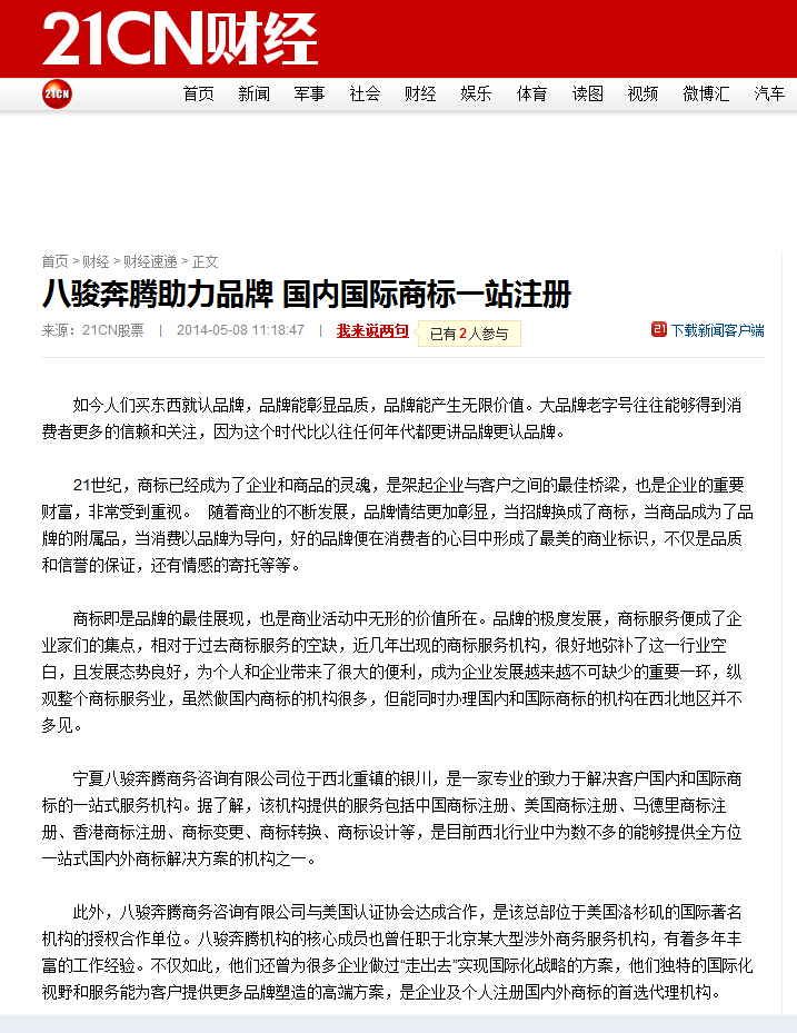 21财经报道—宁夏八骏奔腾国内国际商标一站注册